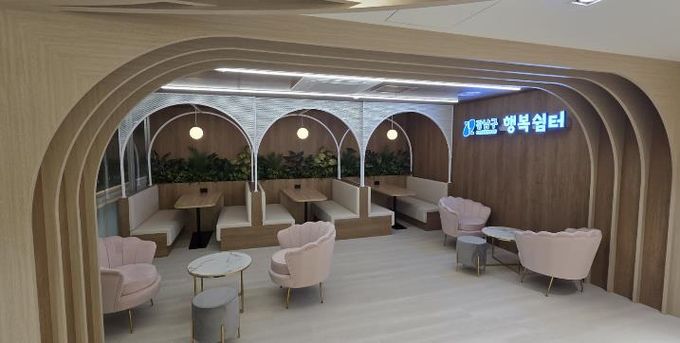 행복쉼터에는 계단형 휴게공간, 포켓형 공간, 창가 테이블, 바(Bar) 테이블 공간을 조성하고, 공간 특성에 맞는 테이블과 의자를 배치했다. 개인 방문객은 물론 가족 단위 이용객도 편리하게 이용할 수 있도록 동선을 정리했으며, 소형 싱크대도 설치했다. 직원과 미화원을 위한 별도 휴게공간도 함께 마련했다.