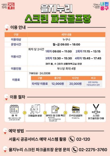 타 구민을 포함한 일반 접수는 매달 23일부터 ‘서울시 공공서비스예약’ 홈페이지나 현장에서 신청할 수 있다. 잔여 타석이 있는 경우 당일 현장 이용도 가능하다. 상세 내용은 을지누리 스크린 파크골프장으로 문의하면 된다.