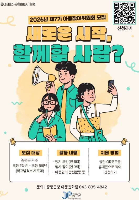 (포탈뉴스통신) 충북 증평군이 아동의 시선에서 지역 정책을 함께 만들어갈 ‘제7기 증평군 아동참여위원회’ 위원 35명을 오는 3월 31일까지 공개 모집한다.
