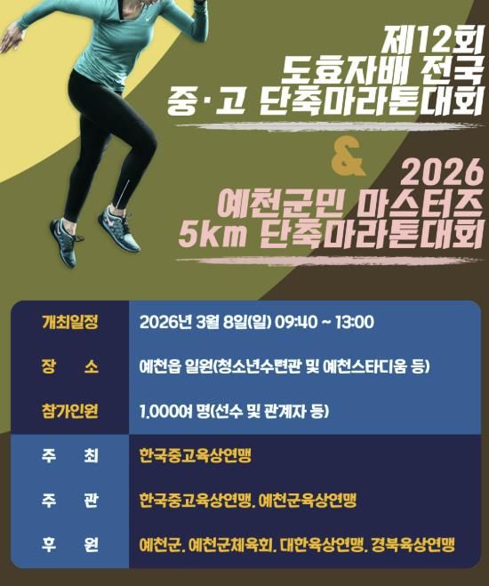 (포탈뉴스통신) 예천군은 오는 8일 오전 10시부터 예천읍 일원에서 '제12회 예천 도효자배 전국 중·고 단축마라톤대회' 및 '2026 예천군민 마스터즈 단축마라톤대회'를 개최한다고 밝혔다.