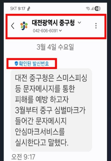 (포탈뉴스통신) 대전 중구는 구청에서 발송하는 구정 안내 및 민원처리 관련 문자메시지의 신뢰도를 높이고 스미싱 피해를 예방하기 위해 ‘안심마크서비스(RCS)’를 본격 시행한다고 5일 밝혔다.