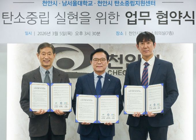 (포탈뉴스통신) 천안시는 5일 시청 제1소회의실에서 남서울대학교, 천안시 탄소중립지원센터와 ‘탄소중립 시민 저변 확대를 위한 업무협약’을 체결했다고 밝혔다.