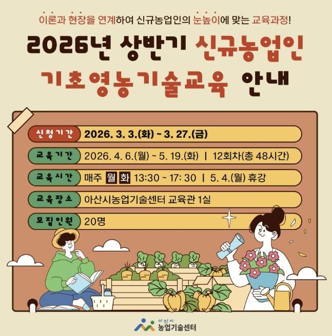 (포탈뉴스통신) 아산시는 신규농업인의 안정적인 농업·농촌 정착을 지원하기 위해 ‘2026년 상반기 신규농업인 기초영농기술교육’ 교육생을 오는 3월 27일까지 아산시농업기술센터 홈페이지를 통해 온라인으로 모집한다.