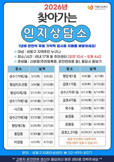 (포탈뉴스통신) 서울 성동구 치매안심센터는 3월 5일부터 4월 30일까지 17개 동 주민센터를 순회하며 치매 조기 검진을 실시하는 ‘2026 찾아가는 인지상담소’를 운영한다고 밝혔다.