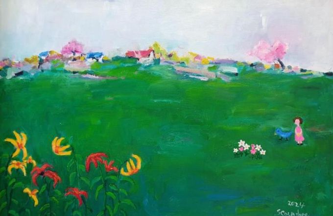 김성희 작가는 들풀들이 만든 푸른 빛 벌판 사이 형형색색의 꽃과 사람을 함께 그려 넣었고, 별처럼 빛나는 꽃들 사이에 숨어 있는 파랑새를 통해 우연히 만나는 행복을 표현했다.