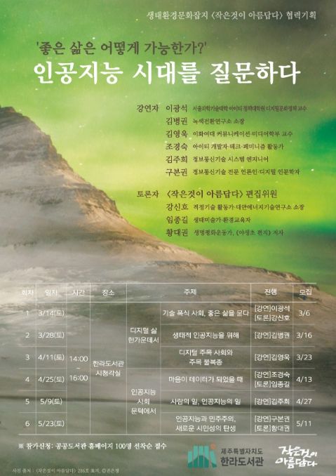 강연 일정은 ▲ 3월 14일 기술 폭식 사회, 좋은 삶을 묻다(이광석 교수, 강신호 편집위원) ▲ 3월 28일 생태적 인공지능을 위해(김병권 작가) ▲ 4월 11일 디지털 주목 사회와 주목 불복종(김영욱 교수) ▲ 4월 25일 마음이 데이터가 됐을 때(조경숙 작가, 임종길 편집위원) ▲ 5월 9일 사람의 일, 인공지능의 일(김주희 교수) ▲ 5월 23일 인공지능과 민주주의, 새로운 시민성의 탄생(구본권 기자, 황대권 편집위원)으로 구성됐다.