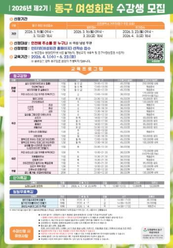 (포탈뉴스통신) 인천 동구는 오는 3월 9일~4월 3일까지‘2026년 제2기 동구 여성회관’ 수강생을 모집한다고 밝혔다.