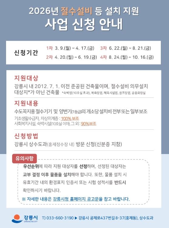 자세한 사항은 시청 누리집 고시·공고란에서 확인할 수 있으며, 신청은 강릉시 상하수도사업소 상수도과를 방문해 할 수 있다.