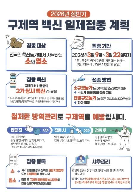 (포탈뉴스통신) 홍천군은 구제역 유입 방지와 완전 차단을 위해 상반기 구제역 일제 백신접종을 실시한다. 대상은 1,001 농가 36,830두(소 928 농가 33,566두, 염소 73 농가 3,264두) 사육 농가이다.
