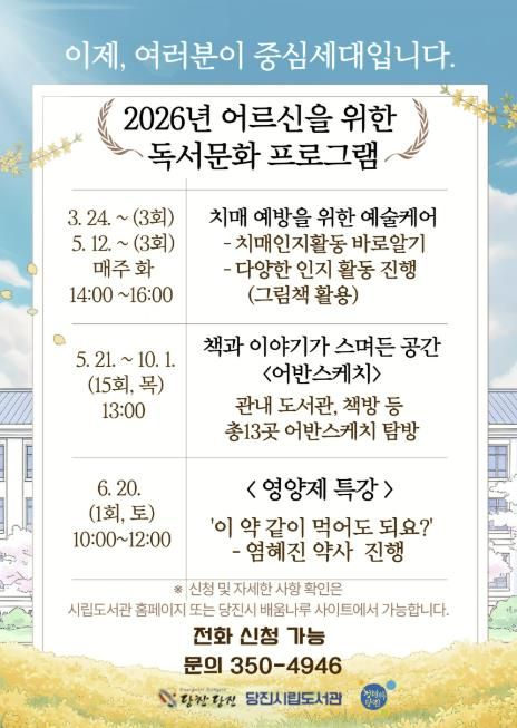 (포탈뉴스통신) 당진시는 어르신들이 책을 매개로 다양한 문화 활동을 경험하며 건강과 삶의 질을 높이기 위해 시립송악도서관에서 어르신 대상 독서문화 프로그램을 운영한다고 10일 밝혔다.