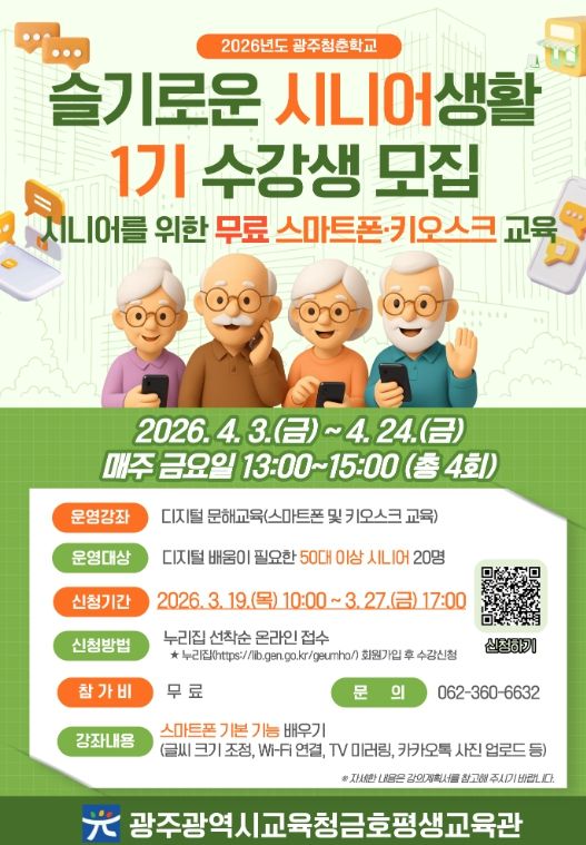 (포탈뉴스통신) 광주시교육청금호평생교육관은 오는 4월 3일부터 7월 31일까지 50대 이상 시니어를 대상으로 디지털 역량 강화 프로그램인 ‘2026 슬기로운 시니어생활’을 운영한다.