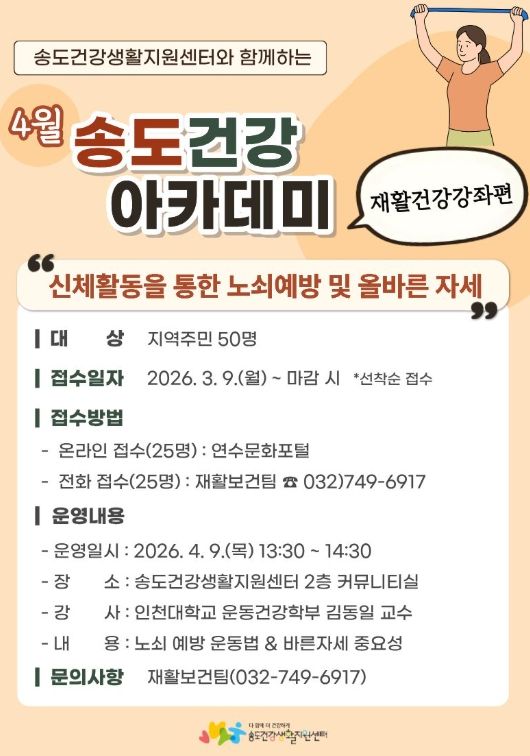 강좌는 4월 16일 13시 30분부터 14시 30분까지 송도건강생활지원센터 2층 커뮤니티실에서 진행된다.
