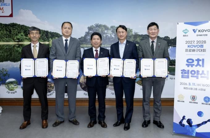 (포탈뉴스통신) 한국배구연맹에서 주최하는 KOVO컵 프로배구대회가 2027, 2028년 2년 연속 제천시에서 개최된다. 제천시는 11일 한국배구연맹(KOVO)과 '2027, 2028 제천·KOVO컵 프로배구대회' 유치 협약을 체결하고 대회 개최를 공식 확정했다.