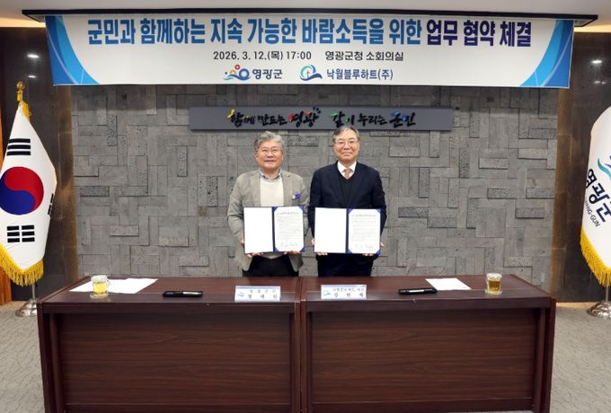 (포탈뉴스통신) 영광군은 지난 12일 영광군청 소회의실에서 ‘영광 낙월 해상풍력 발전사업’을 추진 중인 낙월블루하트㈜(대표 강현재)와 군민과 함께하는 지속 가능한 바람소득을 위한 업무 협약을 체결했다고 밝혔다.