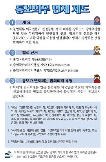 또한, 외국인은 범죄피해를 당하더라도 불법체류 등 강제추방등을 우려해 피해신고를 기피하고 있어 범죄피해 불법체류 외국인 통보의무 면책제도를 현장 대면 홍보 활동으로 적극 홍보하고, 외국인 근로자에 대한 범죄피해 신고 활성화로 불법행위는 끝까지 추적하여 엄정하게 사법처리 할 예정이다.