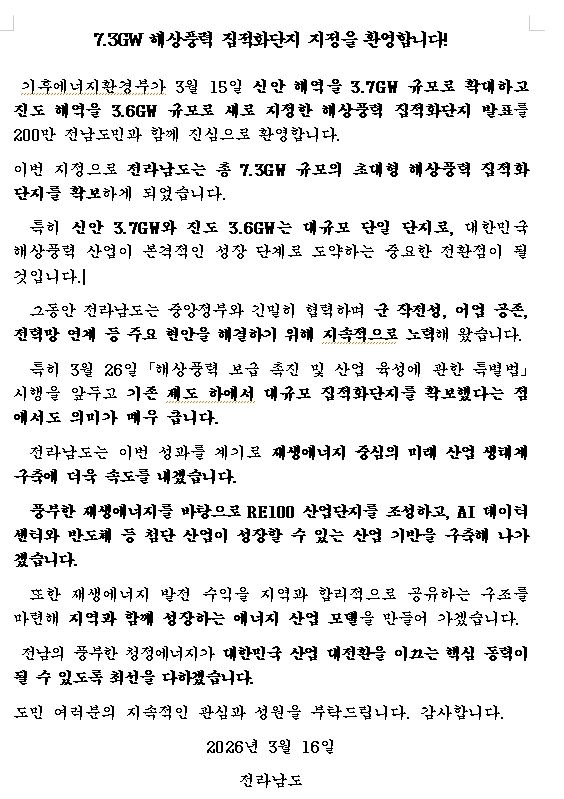 전남도 관계자는 “이번 성과는 전남이 대한민국 미래 에너지 산업을 선도하는 중요한 계기가 될 것”이라며 “풍부한 재생에너지 경쟁력을 바탕으로 글로벌 해상풍력 기업과 AI·반도체 등 첨단 산업을 유치해 지역 산업 구조의 대전환을 이끌겠다”고 말했다.