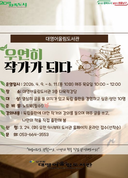 오는 4월 9일부터 6월 11일까지 매주 목요일 오전 10시에서 오후12시까지 총 10회에 걸쳐 대명어울림도서관에서 운영될 예정으로, 글쓰기에 열의를 갖고 독립출판을 경험해 보고 싶은 성인이라면 누구나 참여할 수 있으며 수강료는 무료이다.
