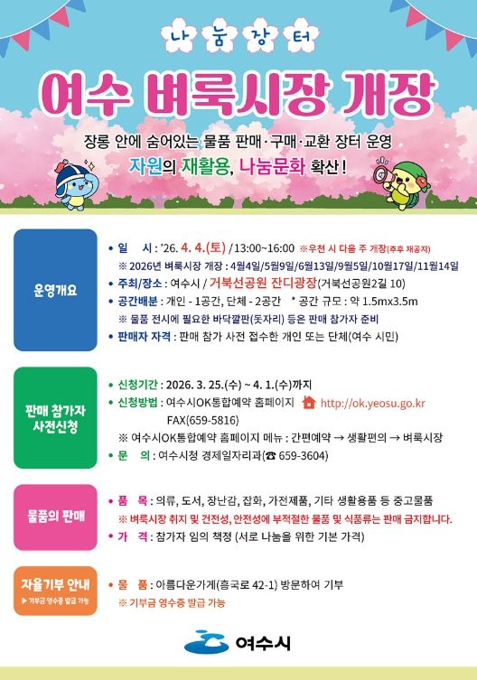 시 관계자는 “여수 벼룩시장은 2013년부터 나눔문화 확산과 이웃 간 소통의 장으로 꾸준히 사랑받아 온 행사”라며 “올해도 성공적인 개장을 위해 많은 시민들의 관심과 참여를 바란다”라고 말했다.