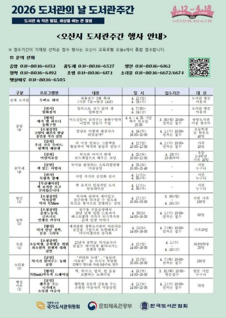 (포탈뉴스통신) 오산시는 2026년 도서관의 날(4월 12일)과 도서관주간(4월 12일~4월 18일)을 맞아 시민 누구나 참여할 수 있는 다양한 독서문화 행사를 운영한다고 밝혔다.