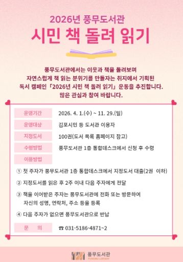 (포탈뉴스통신) 김포시 풍무도서관은 오는 4월부터 ‘2026년 시민 책 돌려 읽기’ 독서 릴레이를 운영한다.