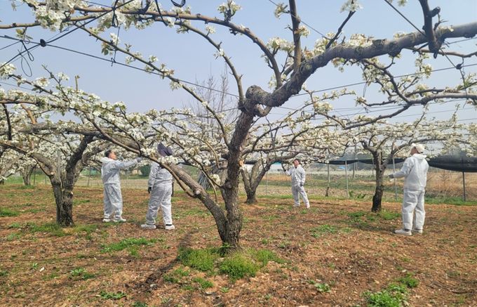 다만, 꽃 피는 시기 기온이 낮으면 곤충 활동이 줄어 자연 수분이 어려워지므로 인공수분에 더욱 신경을 써서 배 꽃이 40-80% 정도 피었을 때 실시하고 기상여건을 고려한 세심한 관리가 요구된다.