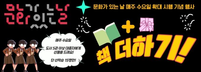 '책 더하기'는 2026년 4월 1일부터 시작된 행사로, 매주 수요일 ‘문화가 있는 날’에 도서 5권 이상을 대출하는 이용자 선착순 15명에게 소정의 선물을 증정하는 프로그램이다.