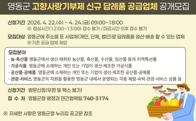 (포탈뉴스통신) 충북 영동군이 2026년도 고향사랑기부제 신규 답례품 공급업체를 모집한다고 8일 밝혔다.