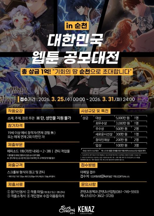 (포탈뉴스통신) 순천시와 ㈜케나즈가 공동으로 주최한 '대한민국 웹툰 공모대전 in 순천'이 전국적인 관심 속에 성황리에 접수를 마쳤다.