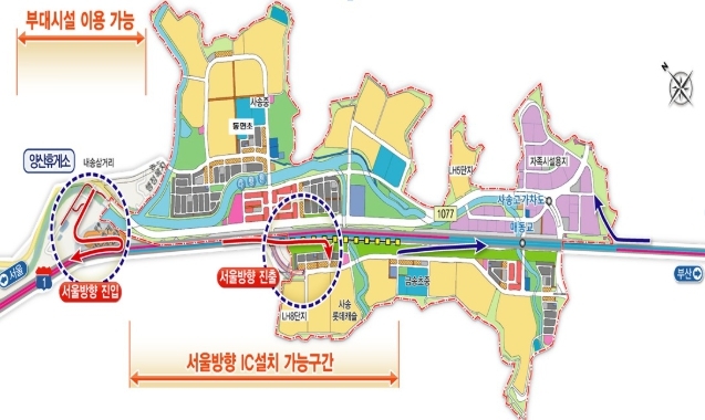 또 앞서 발표된 부산방향 진출입 노선 및 사송지구와의 연계성, 하이패스 IC 설치 기준(고속도로 분기점과 1㎞, IC ․ 휴게소와 2㎞ 이상) 등을 종합적으로 검토한 결과, 서울방향 진입 노선(안)은 양산휴게소를 활용하는 방안이 사실상 유일한 것으로 분석됐다.