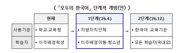 (포탈뉴스통신) 교육부와 한국교육학술정보원(원장 정제영)은 국정과제 101번 ‘교육격차 해소를 위한 공교육 강화’의 일환으로, 이주배경학생 한국어교육을 위해 운영 중인 '모두의 한국어' 시스템의 사용기관과 학습자 범위를 단계적으로 확대한다고 밝혔다.