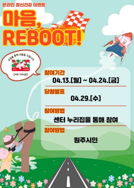 (포탈뉴스통신) 원주시정신건강복지센터는 온라인 정신건강 이벤트‘마음, REBOOT’를 오는 4월 13일부터 4월 24일까지 진행한다.