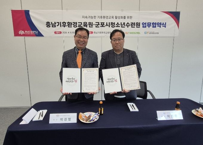 충남도립대학교 부속기관인 충남기후환경교육원은 군포시청소년수련원과 ‘지속가능한 기후환경교육 활성화’를 위한 업무협약(MOU)을 체결했다고 밝혔다.