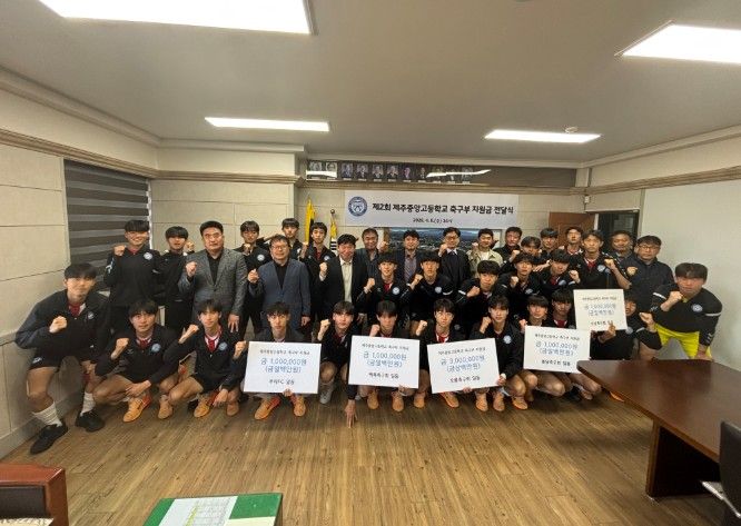이는 지난해 제1회 장학금 800만원에 이어 두 번째 후원으로 제주 지역 생활체육 축구를 이끄는 5개 축구회가 제주중앙고 축구부 학생들이 훈련에 전념할 수 있는 환경을 조성하고 백호기 대회 등에서 보여준 노력과 성과를 격려하기 위해 마련한 것이다.
