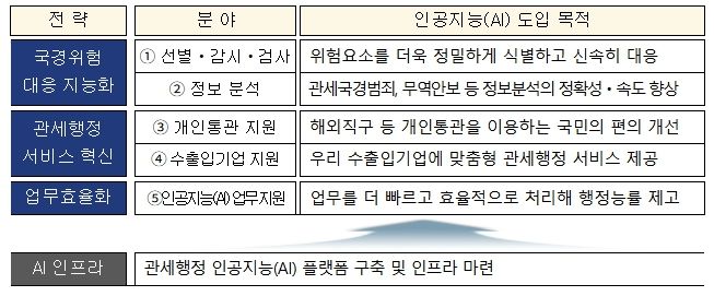이러한 기반을 바탕으로 이번 ISP 사업에서는 관세행정 전반에 인공지능을 체계적으로 도입하기 위한 중장기 전략을 수립한다. 인공지능 챗봇 등 단순한 인공지능(AI) 기능 도입에 그치지 않고 인공지능 기반 업무수행 방식, 데이터 관리·활용 체계, 기술 개발·운영 시설 및 관리체제 등을 종합적으로 설계하고 단계별 이행안을 마련할 계획이다.