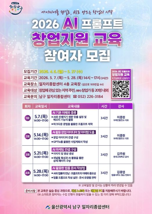 (포탈뉴스통신) 울산 남구 일자리종합센터는 급변하는 AI(인공지능) 산업 환경에 발맞춰 지역 예비 창업자들을 위한 ‘2026 Al 프롬프트 창업지원 과정’ 교육생을 모집하고 있다고 17일 밝혔다.