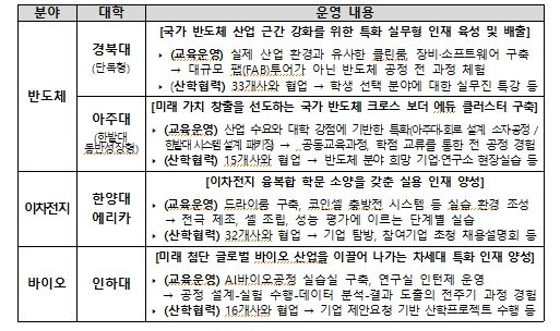2025년 첨단산업 특성화대학 28개 사업단(38개교)에서는 총 693개의 기업과 함께 총 434건의 교과목(기업 협업 교과목 232건)을 개발·개선하는 등 산업계 친화형 교육과정을 운영하여, 총 3,576명의 인재를 양성했다. 또한, 반도체 팹(FAB) 등 기반 시설을 구축하고 실험·실습 장비를 도입하여 현장 중심 교육 환경을 조성하는 한편, 공동·복수학위 제도 운영 및 교원업적 평가 규정 개선 등 제도 개선을 통해 특성화 분야 교육을 활성화했다.