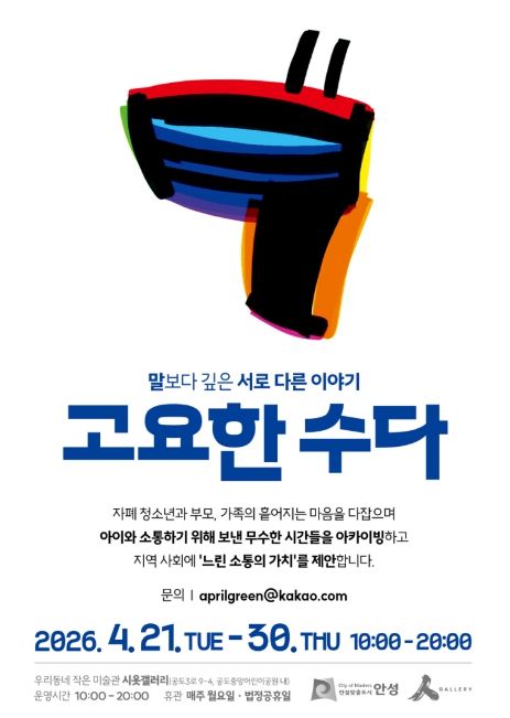 (포탈뉴스통신) 안성시 시옷갤러리는 오는 4월 21일부터 4월 30일까지 자폐 청소년과 그 가족이 함께 참여하는 전시 《고요한 수다》를 개최한다고 밝혔다.