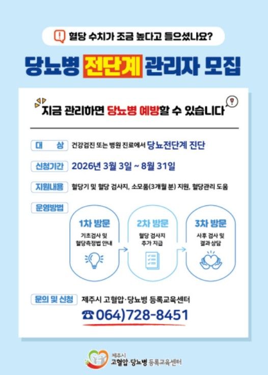 (포탈뉴스통신) 제주보건소는 시민의 만성질환 예방과 건강관리 능력 향상을 위해 ‘당뇨병 전단계 관리사업’과 ‘건강행태개선 독려사업’을 추진하고 있다.