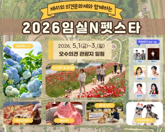 군은 오는 5월 1일부터 3일까지 임실 오수의견관광지 전역에서 제41회 의견문화제와 연계한‘2026 임실N펫스타’를 개최한다고 밝혔다.