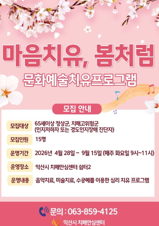 한편, 익산시 보건소 치매안심센터는 전주대학교 산학협력단과 함께 문화체육관광부 공모사업 '마음치유, 봄처럼'에 선정돼 프로그램을 추진한다.