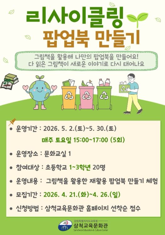 장병진 삼척교육문화관장은 “기존 그림책을 재활용해 팝업북으로 다시 구성하는 활동을 통해 어린이들이 책을 새롭게 바라보고 창의적으로 표현하는 즐거움을 느끼는 한편, 자원 순환의 가치도 자연스럽게 체득하길 바란다”라고 말했다.