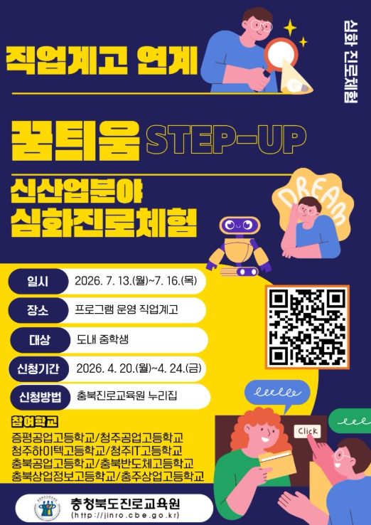 (포탈뉴스통신) 충청북도교육청 직속기관 진로교육원은 미래 신산업 분야에 대한 학생들의 진로설계 역량을 높이기 위해 '2026. 꿈틔움 STEP-UP 직업계고 연계 신산업 분야 심화 진로체험'을 운영한다고 밝혔다.