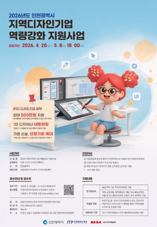 (포탈뉴스통신) 인천테크노파크(인천TP)는 오는 5월 8일까지 지역 디자인 산업의 경쟁력 강화를 위한 ‘2026 지역디자인기업 역량강화 지원사업’에 참여할 1인 디자인기업을 모집한다고 밝혔다.