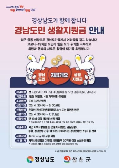 이번 생활지원금은 1인당 10만 원이 지급되며, 지급 대상은 3월 18일 기준 경상남도에 주민등록을 둔 전 도민으로 합천군의 지급대상자는 총 39,382명이다. 신청기간은2026년 4월 30일부터 6월 30일까지이며, 온·오프라인 모두 신청가능하다.