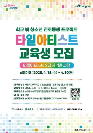 (포탈뉴스통신) 송파구는 서울시 ‘약자와의 동행’ 공모사업으로 학교 밖 청소년들의 사회진입과 자립을 돕기 위한 ‘타일아티스트 교육’을 실시한다고 24일 밝혔다.
