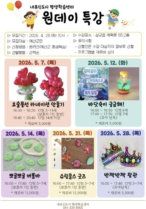 (포탈뉴스통신) 예산군 내포신도시 평생학습센터는 5월을 맞아 지역 어린이를 위한 체험형 원데이 특강 프로그램을 운영한다.