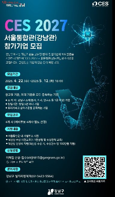 (포탈뉴스통신) 꿈이 모이는 도시, 미래를 그리는 강남구가 세계 최대 IT·전자 전시회인 CES 2027을 무대로 관내 스타트업의 글로벌 진출 지원에 나선다. 강남구는 ‘CES 2027 서울통합관(강남관)’에 참여할 스타트업을 4월 22일부터 5월 12일까지 모집한다.
