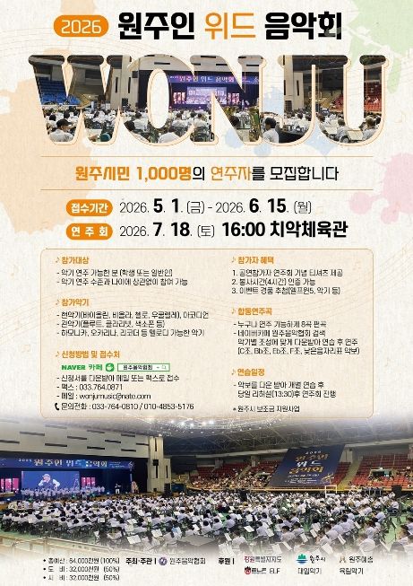 (포탈뉴스통신) (사)한국음악협회 원주지부는 오는 7월 18일 열리는 ‘2026 원주인 위드 음악회’에 참여할 시민 연주자 1,000명을 모집한다.