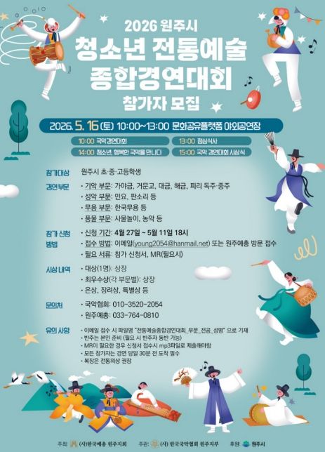 모집 부문은 ▲전통예술 종합경연대회 ▲청소년 트로트·가요·댄스 페스티벌 ▲원주청소년연극제 ▲학생음악콩쿠르 ▲치악산 전국 청소년 백일장 등 총 5개 분야다.