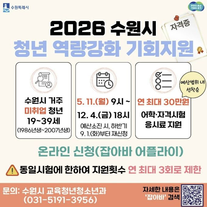 (포탈뉴스통신) 수원특례시는 미취업 청년의 취업 준비 비용 부담을 덜어주는 ‘청년 역량강화 기회 지원 사업’을 12월 4일까지 운영한다. 미취업 청년에게 어학·자격시험 응시료를 1인당 연 최대 30만 원 지원한다.